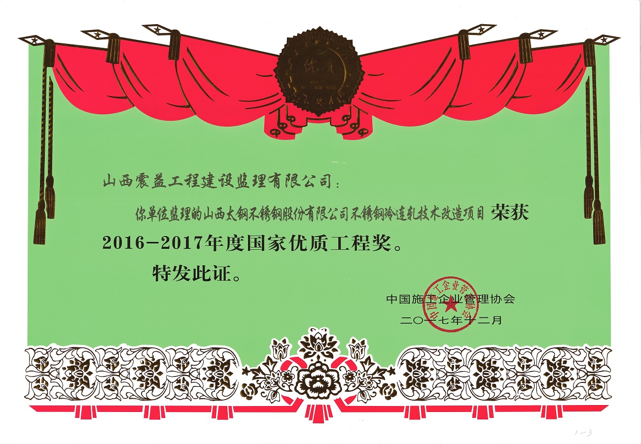 公司先后承擔(dān)了冶金、機械、電力、礦山、市政、環(huán)保、房屋建筑等工業(yè)及民用建設(shè)大中型工程項目1000余個,足跡遍及國內(nèi)二十多個省市,在全國各地四千余個制造廠家進(jìn)行了駐廠設(shè)備監(jiān)理,工程監(jiān)理也立足省內(nèi)輻射全國多個省區(qū)乃至國外。多年來,我們憑著嚴(yán)格監(jiān)理、優(yōu)質(zhì)服務(wù)的工作作風(fēng)贏得業(yè)主的信任和好評,受監(jiān)工程質(zhì)量合格率均為100%。由我公司監(jiān)理的太鋼7.63m焦?fàn)t(及配套化產(chǎn))工程、450㎡燒結(jié)工程、4350m3高爐工程、400萬噸煉鋼/連鑄工程、2250mm熱軋工程、新不銹鋼冷軋工程、熱軋加熱爐工程、冶煉廢水處理工程、BOC制氧工程、40萬噸及50萬噸不銹鋼冷軋工程、制鐵煉鋼節(jié)能減排660㎡燒結(jié)機工程、不銹鋼冷軋光亮板結(jié)構(gòu)調(diào)整工程、型材系統(tǒng)改造一期徑鍛機工程、加工廠礦渣超細(xì)粉二期工程、2250mm熱連軋罩式爐工程、2250mm熱連軋新建鋼卷表面處理線工程、袁家村鐵礦項目、不銹冷連軋技術(shù)改造工程、硅鋼冷連軋技術(shù)改造工程等等多項工程項目均獲得了“冶金工業(yè)優(yōu)質(zhì)工程”獎;日貸清潔生產(chǎn)90噸電爐工程獲山西省“汾水杯”質(zhì)量獎;太原濱河小區(qū)、19宿舍、太鋼2*300MW自備電廠、太原市不銹鋼工業(yè)園區(qū)等工程獲太原市“******文明施工樣板”工地;太鋼不銹2*300MW自備電廠改擴建煙筒構(gòu)筑物工程、太鋼2*300MW空冷供熱機組儲煤筒倉建筑工程、山西太鋼不銹鋼科技冷軋精密帶鋼工程等獲“山西省優(yōu)良工程”;1350 m3高爐、400萬噸煉鋼/連鑄工程獲得******建設(shè)工程“魯班”獎、不銹冷連軋技術(shù)改造工程獲“******優(yōu)質(zhì)工程獎”。太鋼150萬噸不銹鋼系統(tǒng)工程同時獲******“建國60年來經(jīng)典暨精品工程”獎、“******優(yōu)質(zhì)工程金質(zhì)獎”、******工程建設(shè)“魯班”獎三項大獎。